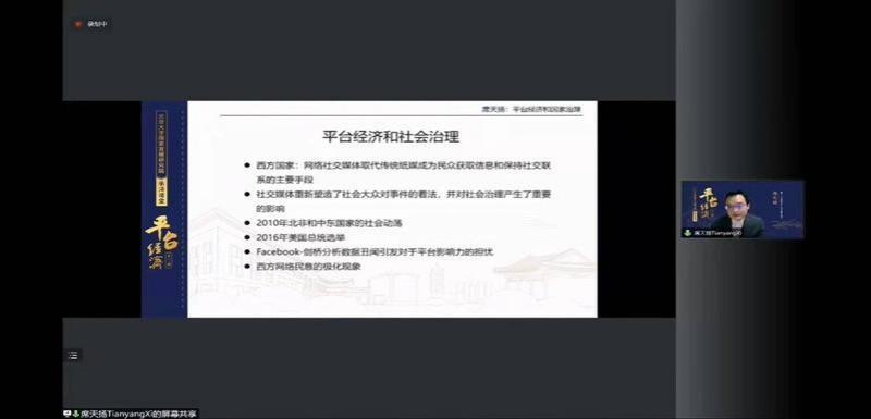 2021年12月7日晚20:00,北京大学国家发展研究经理聘副教授席天扬老师为我们带来了“北京大学国家发展研究院承泽课堂平台经济第十二讲之第六讲——平台经济和国家治理”的直播互动。本次直播由北京大学国家发展研究院沈艳教授主持,全体会计硕士在纪晶华教授的组织下观看了本次直播。