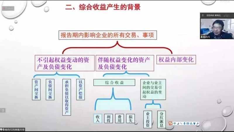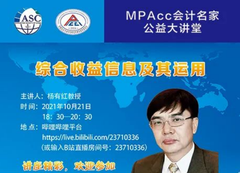 2021年10月21日下午6点30分,20级会计专硕全体员工在线上收看MPAcc会计名家公益大讲堂系列讲座。该系列讲座由中国会计学会、中国会计专业学位研究生教育指导委员会共同主办,本期主讲系中国人民大学博士、中国会计学会内部控制委员会副主任杨有红教授,专题内容为“综合收益信息及其运用”。