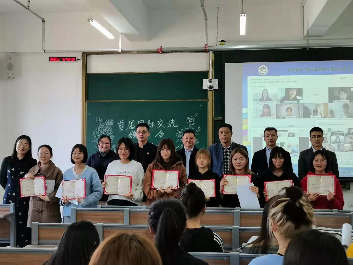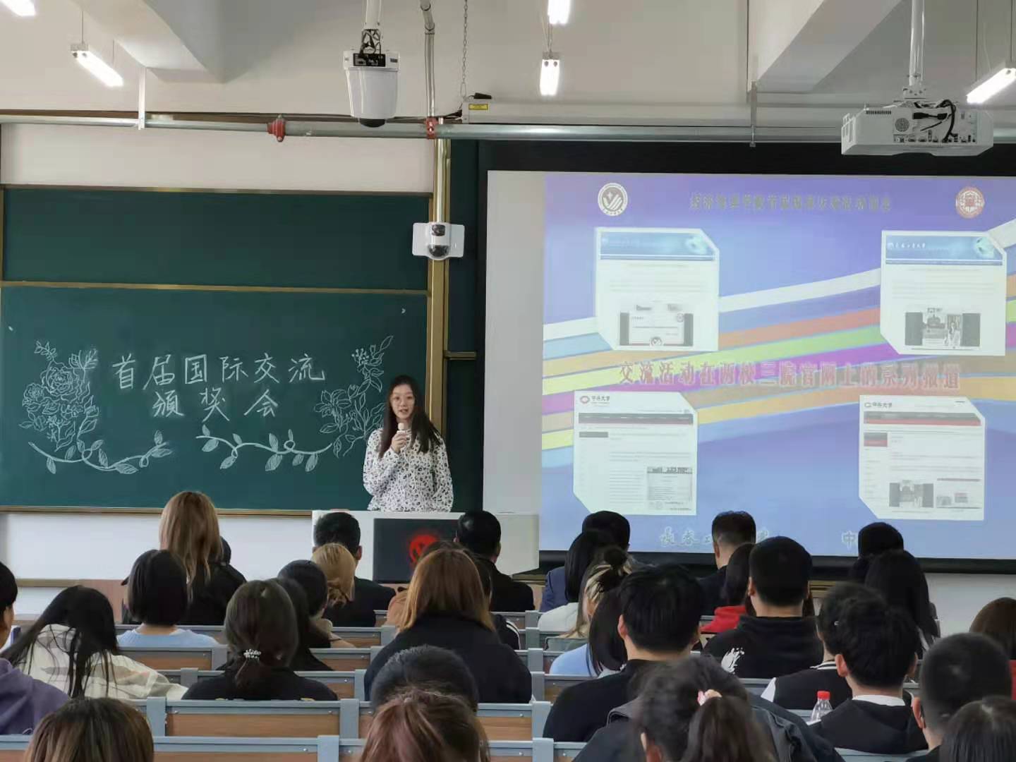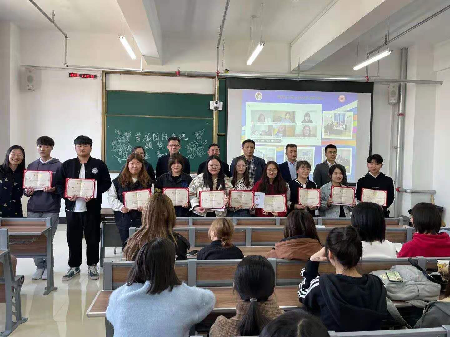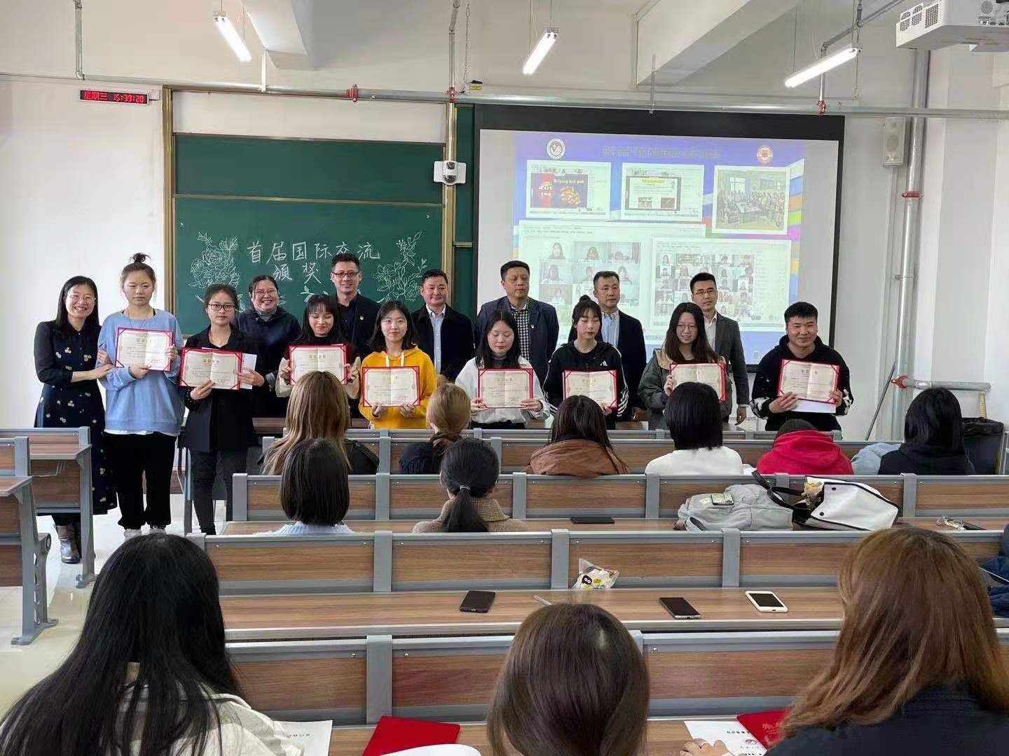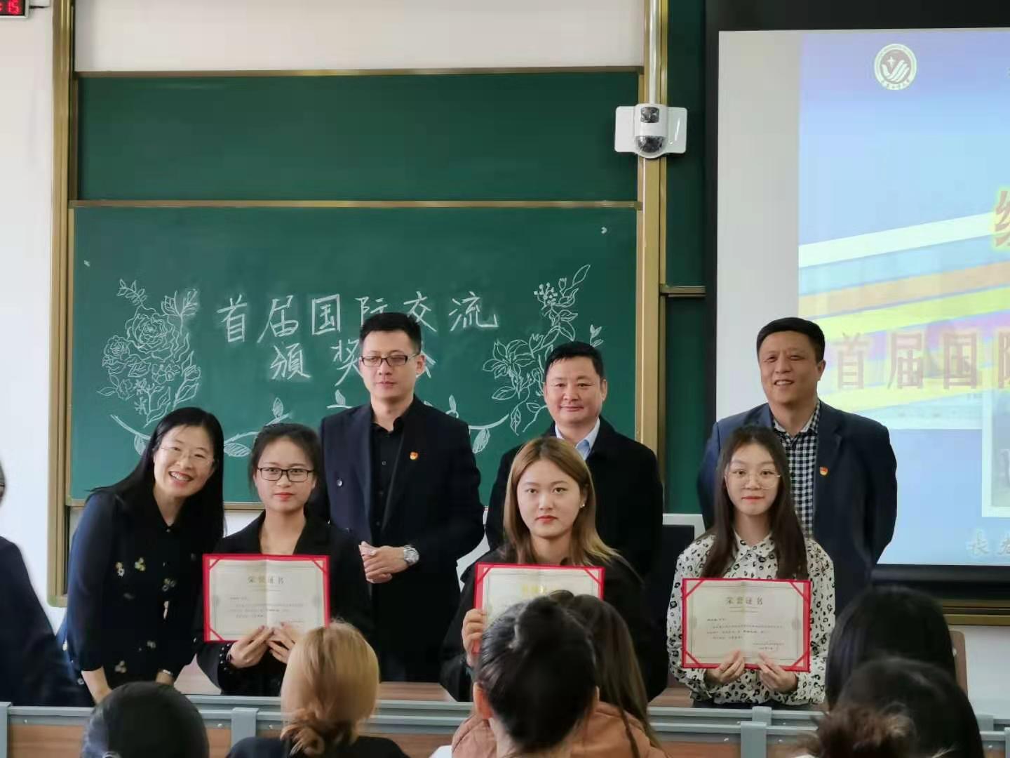 4月14日下午3:00,学院首届国际交流活动总结表彰大会在东区主楼419教室举行。本次大会由国际交流活动的带队指导教师高鹤老师主持。经理张玉智,副经理王涛,副经理黄鑫昊,党委副书记孙兆龙,经济系主任张璇,党支部书记孙小明出席表彰会。同时,2019级国际经济与贸易专业和金融学专业的员工也自愿前来参加,聆听了2018级学长们参与活动的过程和取得的成效。
