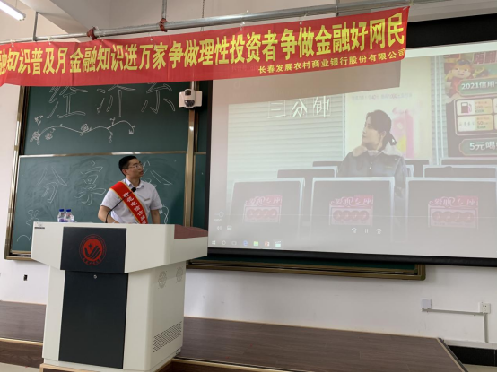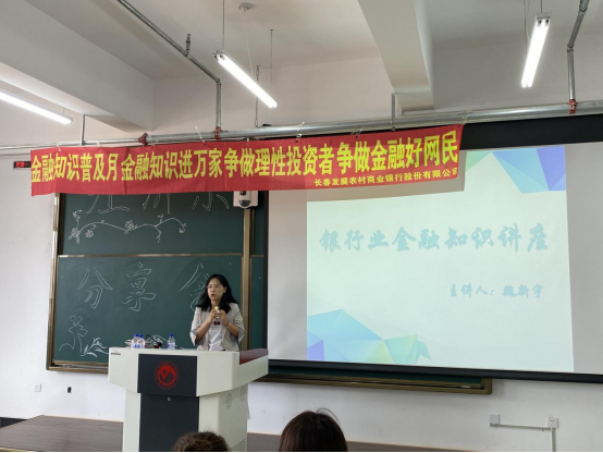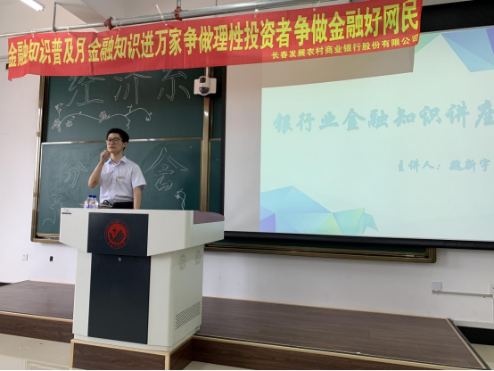 为了使在校员工更好的了解金融常识,提升员工的金融风险防范意识,经济系特别邀请了长春发展农商银行公司业务部魏新宇老师和运营管理部的王超老师于2021年6月28日下午13:30分在主楼419教室为我系2018级和2020级国贸专业员工举办了“普及金融知识,防范金融风险”的专题讲座。本次讲座得到了长春发展农商银行和公司领导的大力支持。本次专题讲座由经济系副主任高鹤和崔月慧老师组织并获得圆满成功。
