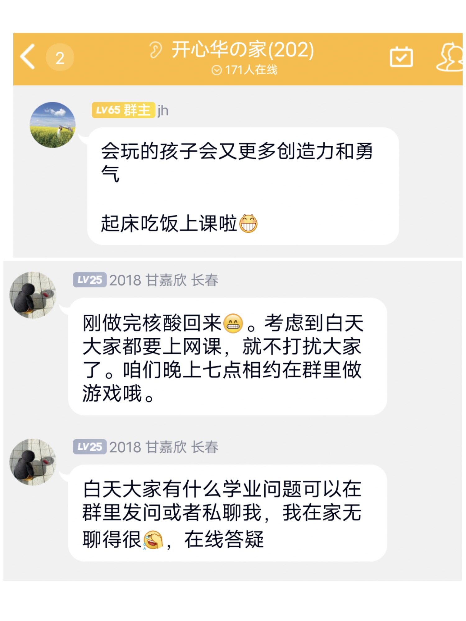 纪老师也多次提醒大家做好防护,无论是生活上的问题还是心理方面的问题都可以和纪老师提出。群里不少已经毕业的学长学姐也暖心的回复大家有困难的时候可以随时联系他们,他们会竭力提供帮助。在这场没有硝烟的战争中,带着关怀和关爱来对待才是应对疫情的正确姿势。