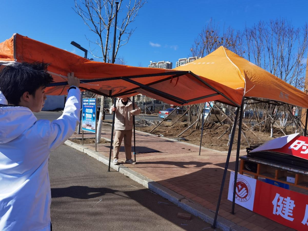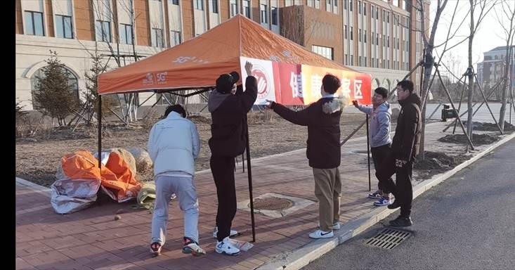 2月25日、26日,学院190501班张宇、吴豪、王跃霖3位同学提前返校,参与志愿活动。25日下午,在北湖东校区负责进校扫码和身份核验。26日清晨,按照学校要求,在学校北湖东区西门分别搭建了“身份检验”,“扫吉祥码”、“消毒区”、“健康监测区”等环节的专属帐篷,并把所需物资搬运至该地点,保证同学们能够正常返校。由于天气原因,下午时分北湖狂风大作,有帐篷直接被吹散,其他帐篷也出现了松动现象。为了保证志愿者和同学们的安全,张宇、吴豪、王跃霖3位同学再次将帐篷加固。在狂风不止时甚至合力用手来稳固帐篷。