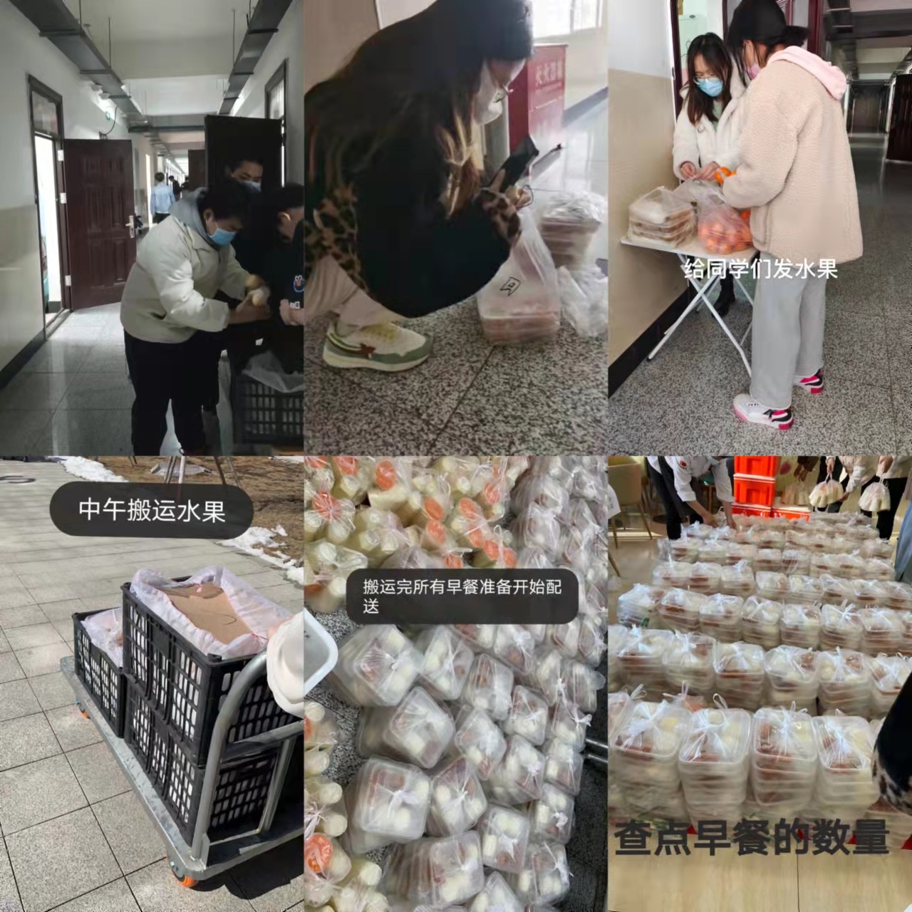 郝成烨为同学们分发早餐和水果