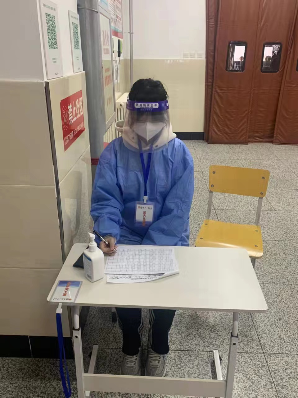 为防范疫情扩散及交叉感染,从根源上阻断病毒传播,封闭管控期间,掌握出入宿舍楼人员的行程并对其进行登记显得尤为重要,210505班的李运琪,就是这项工作的参与者之一。她每天的工作,就是在宿舍一楼的大厅,对出入人员进行登记,一坐就是几个小时,然而她却能够一直坚守着,尽管这项工作辛苦且索然无味,而她的所为,却保障了整个宿舍楼的安全。