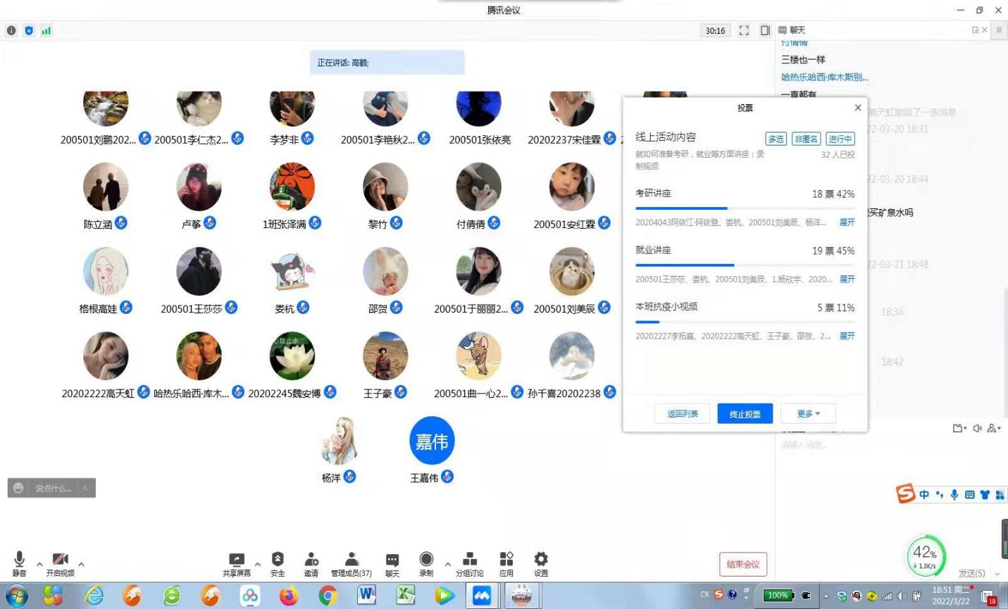 2022年3月22日晚6:30我们的班导师高鹤老师,为我班员工准备了线上活动,活动的内容:考研讲座、就业讲座、本班抗疫小视频、唱歌、跳舞、英语朗读、日语朗读等等。在这晚高鹤老师组织我们在腾讯会议上对考研讲座、就业讲座、抗疫小视频这三项项目进行了投票,来挖掘员工们的兴趣。高鹤老师也根据大家的需求,开始发动身边的力量。
