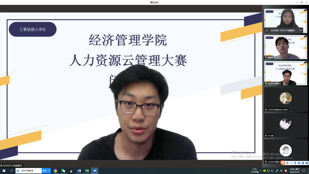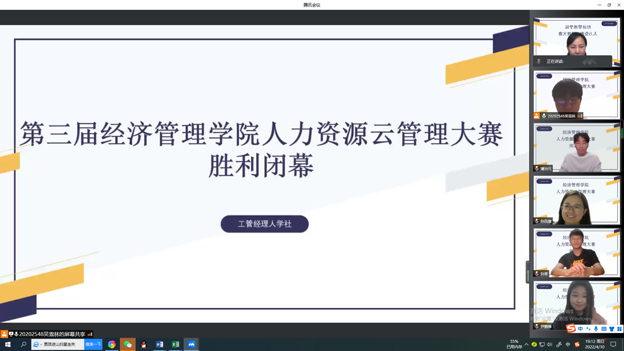 2022年4月9日-10日,工商管理系工管经理人学社组织的ylzzcom永利总站线路检测“第三届人力资源云管理大赛”总决赛顺利完成,10日晚19:00,大赛闭幕式成功举办,大赛圆满收官。工商管理系主任王亚君老师、工商管理系党支部书记孙凤莲老师、工管经理人学社社长孙昊、工管经理人学社秘书长潘治元、组织相关赛事工作的工管经理人学社副社长吴雪林、技术部部长李明谦,以及参赛的二十三支队伍的同学们出席了本次大赛闭幕式。