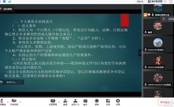 孙韬老师讲授《经济法概论》课程。针对员工对法律具有浓厚兴趣,而又缺乏法律基础的特点。从基本的理论开始,逐步深入。员工只有对于知识有着清晰的认知,形成整体的框架,才能完整掌握该门课程。因此在讲授过程中不仅系统梳理了整体的法律脉络,而且对于每一重要知识点均有详细讲解。务求员工能够即时掌握、加深认识。