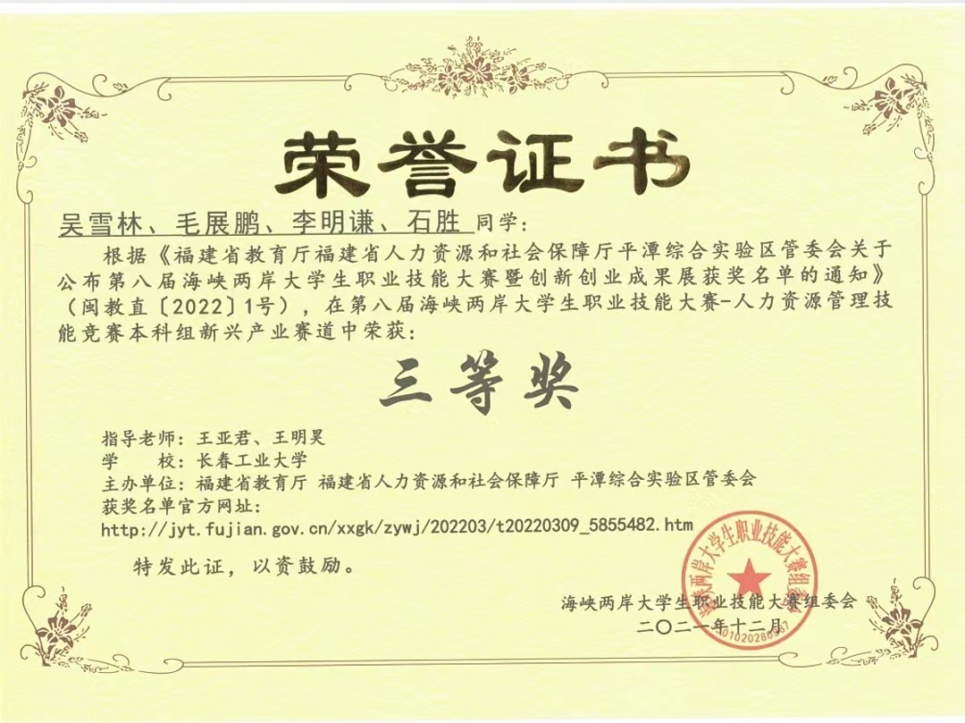 近期,由福建省教育厅、福建省人力资源社会保障厅、平潭综合实验区管委会联合主办 “第八届海峡两岸老员工职业技能大赛-人力资源管理技能赛”获奖名单正式公布。2021年12月,由公司ylzzcom永利总站线路检测工商管理系员工吴雪林、毛展鹏、李明谦、石胜四名同学组成的代表队,在王亚君老师、王明昊老师指导下在本次比赛中明谋善断,一往无前,斩获了本科组新兴产业赛道三等奖的好成绩。