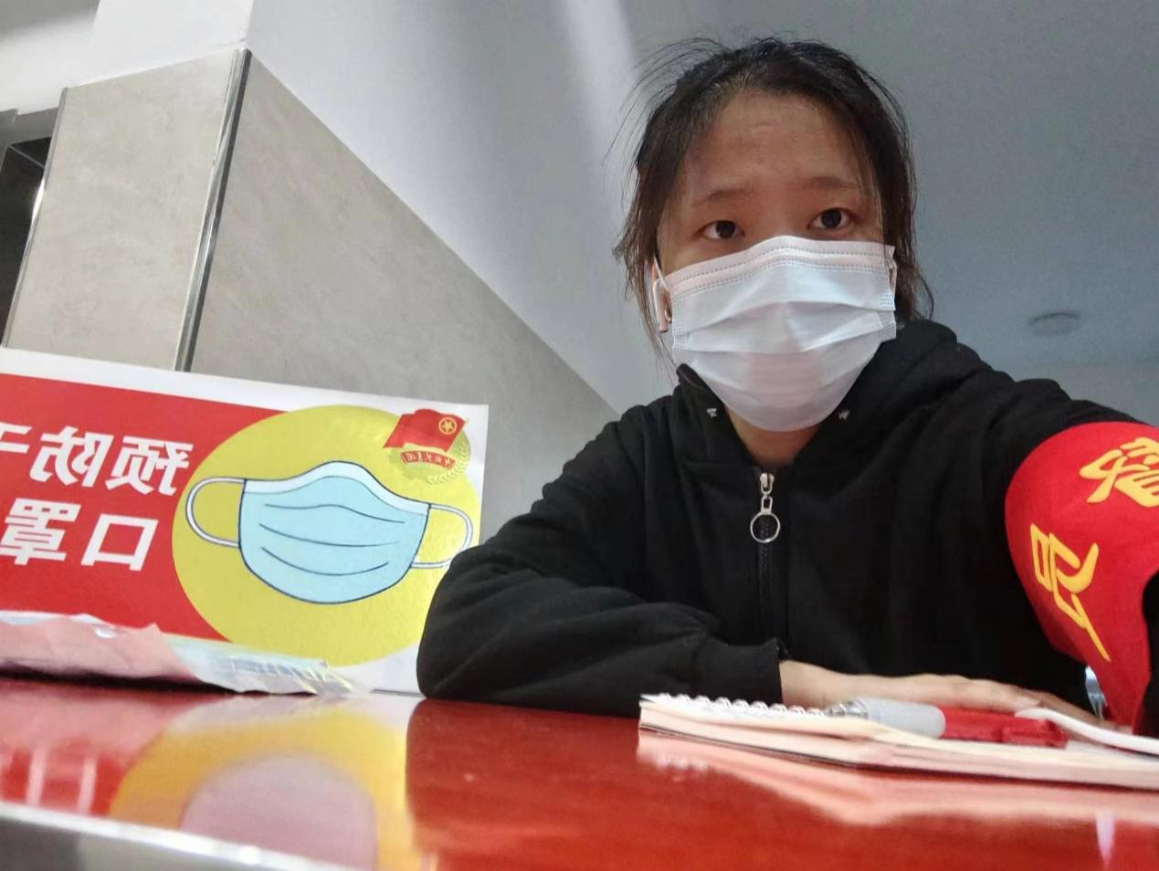 在实施B级管控后,学校在寝室各个楼层设立值班岗位,目的就是严格监督同学们佩戴口罩。210504班的张心如就参与在值班志愿者的行列中。这项任务看似简单,却是疫情防控工作中紧要的一环。戴口罩既是保护自己不被感染,也是当自己有了呼吸道症状时保护身边人的有效措施,是预防传染病的重要防线。