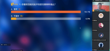 为有效营造学习氛围、管控授课过程,除了在线签到以外,通过课上在线扫码提交问题、远程共享白板、在线问卷问答等手段实现师生交互,提高网络教学效果。在“互联网环境下的商业模式创新”这一章讲授过程中,董老师向员工抛出“你平时都用哪些电子商务平台购物?为什么选择这个平台?”问题,师生间利用白板远程互动,通过对平台优势的总结,员工自然而然地理解了吸引其经常光顾的原因正是源自平台在互联网环境下的商业模式创新。针对互联网“无所不在”的特点,设计调查问卷“你喜欢目前无所不在的互联网环境么?”,多数同学回答喜欢、也有同学回答不喜欢,回答喜欢的原因是互联网确实为社会生活带来了便利,而回答不喜欢则是出于对信息安全的考虑。通过这个设计,告诉员工任何事物都存在两面性,在享受其带来福利的同时一定要对其引发的负面性保持警觉。