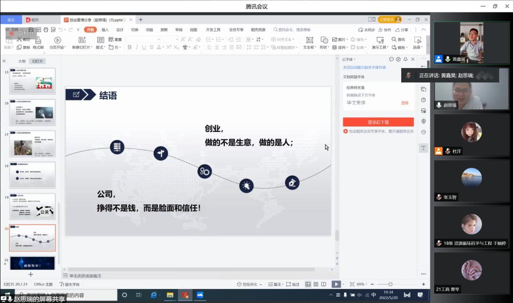 凝聚员工力量、传承经管文化、学习榜样精神、助力学子成才,2022年5月20日18:30,员工论坛2022年第3期在腾讯会议端举行,ylzzcom永利总站线路检测2018级MBA员工赵思瑞作了题为“创业管理实践”的报告。经理张玉智、部分教师、研究生及本科生参加了论坛。论坛由副经理黄鑫昊主持。