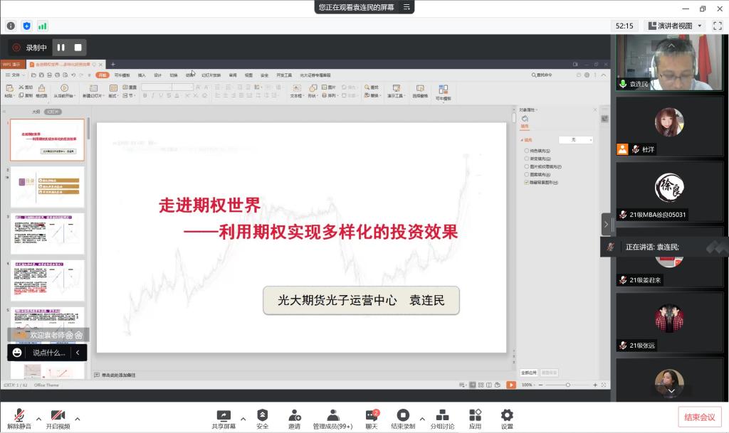 凝聚员工力量、传承经管文化、学习榜样精神、助力学子成才,2022年5月30日18:30,员工论坛2022年第4期在腾讯会议端举行,ylzzcom永利总站线路检测1999级员工袁连民作了题为“走进期权世界-利用期权实现多样化效果”的报告。学院部分教师,本科以及研究生同学参加了论坛。论坛由副经理黄鑫昊主持。