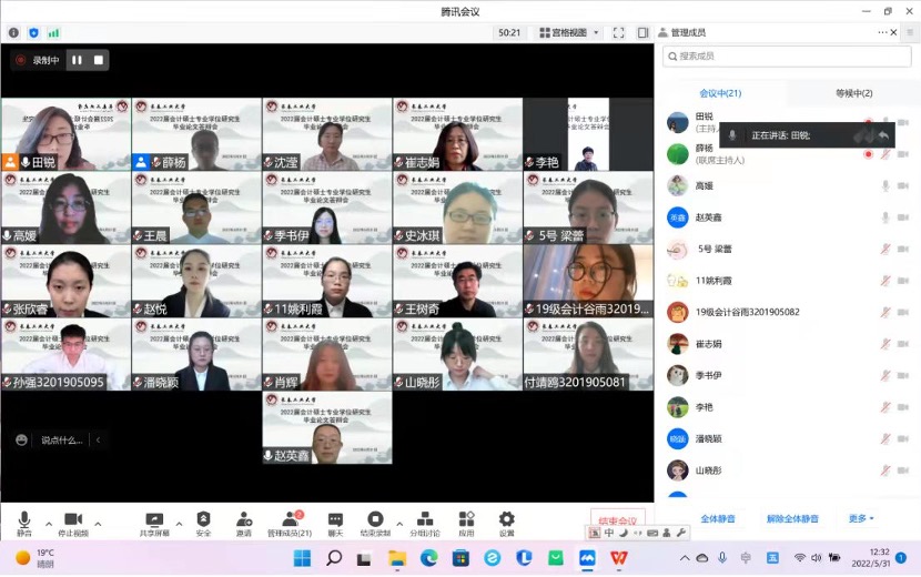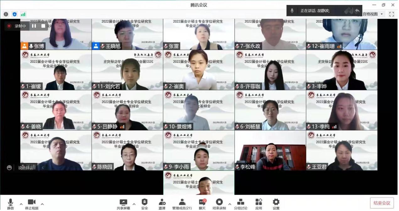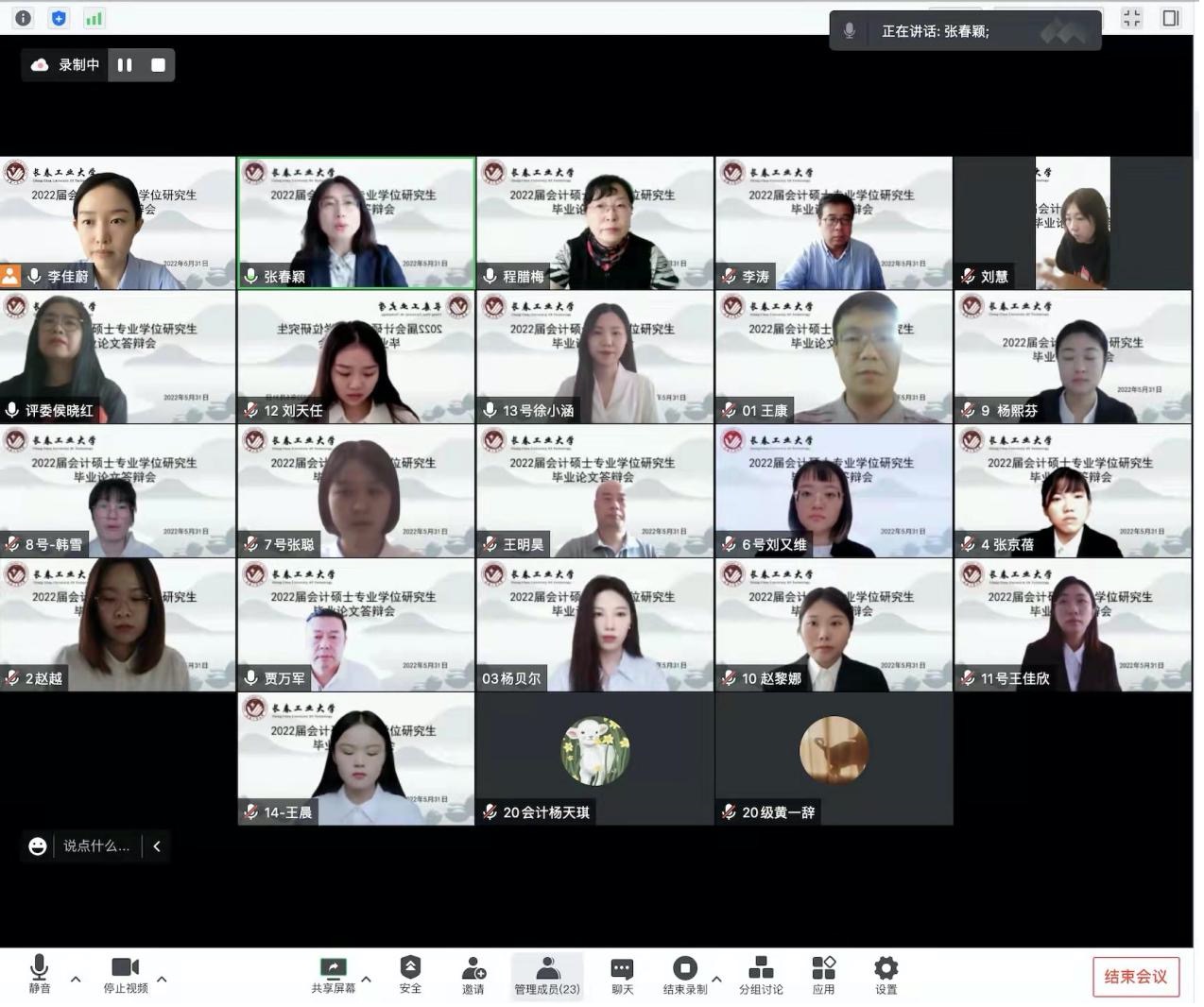 2022年5月31日下午12点30分,ylzzcom永利总站线路检测MPAcc教育中心根据学校研究生院公司产品工作的总体安排和部署,组织了2022届MPAcc硕士毕业答辩。本次毕业答辩采用了腾讯会议线上答辩的方式,下设了4个答辩小组,共涉及54名员工。其中19级会计专硕52人,18级会计专硕2人。答辩过程全程记录,同时低年级同学也可进入会议进行观摩学习。