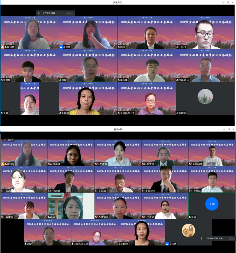 根据学校研究生院公司产品工作的总体安排和部署,2022届金融硕士(MF)专业学位论文和应用经济学硕士学位论文答辩于2022年6月5日上午8:30在腾讯会议举行。本次答辩共有18名同学参加论文答辩,其中金融硕士5名同学以及应用经济学13名同学。答辩委员会成员如下: