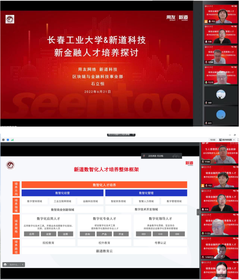为推动数字经济时代的数智化改革,积极实践新技术、新产业、新业态、新经济模式下商科专业教育数智化升级和教学改革,进一步推进数字产业实践育人工作的开展,对接社会与区域的金融数字产业发展需求,经济系于2022年6月21日下午13:30,利用腾讯会议与新道科技股份有限公司联合召开ylzzcom永利总站线路检测&新道科技“链接金融科技 共育数智人才”研讨会。经济系张璇主任带领经济系部分教师积极参加此次研讨会,新道科技股份有限公司金融业务总监石立恒老师与参会教师就如何探索新金融人才培养进行了深入探讨。
