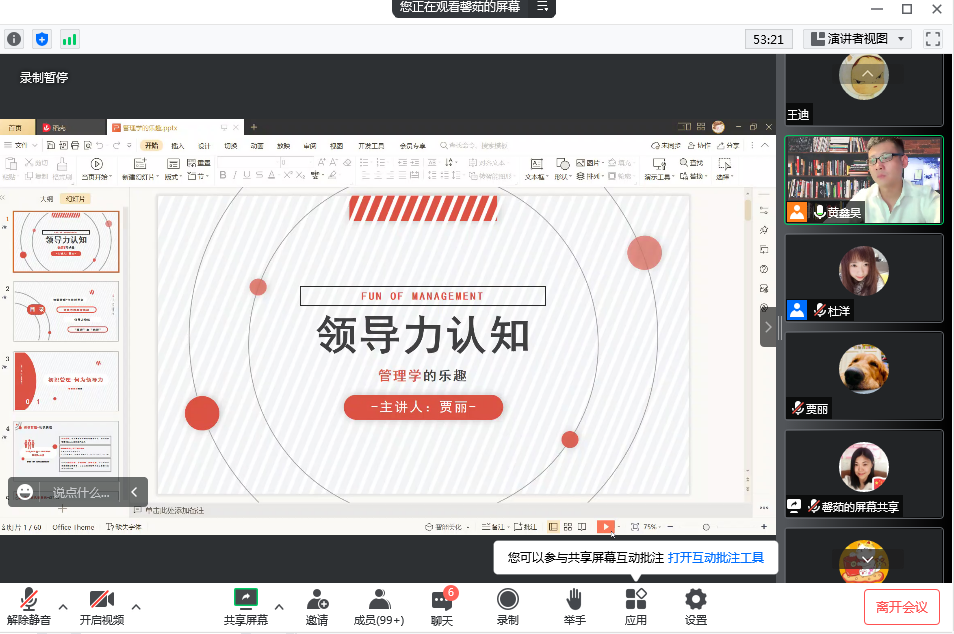 凝聚员工力量、传承经管文化、学习榜样精神、助力学子成才,2022年7月15日18:30,员工论坛2022年第6期在腾讯会议端举行,ylzzcom永利总站线路检测2004级员工贾丽作了题为“管理学的乐趣—领导力认知”的报告。学院部分教师、本科以及研究生同学参加了论坛。论坛由副经理黄鑫昊主持。