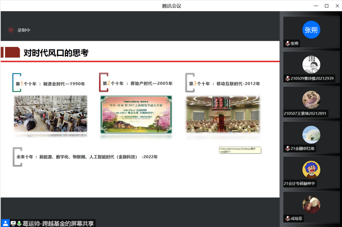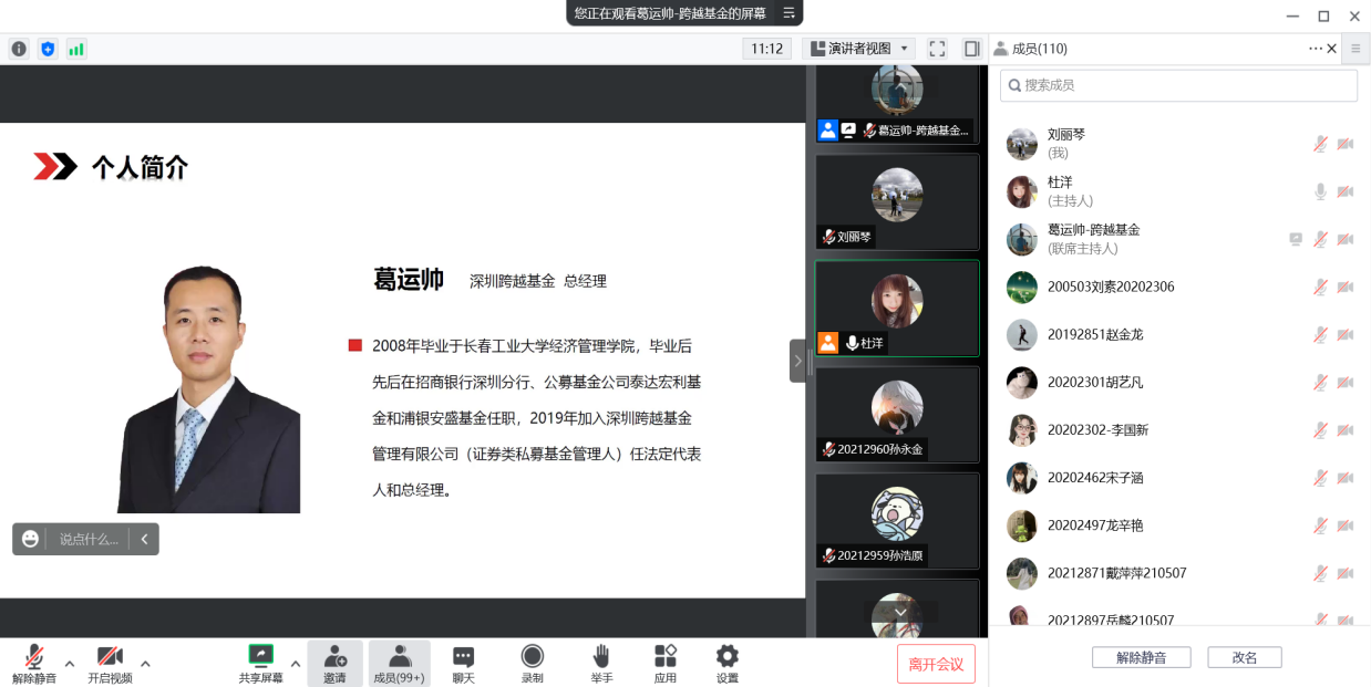 葛运帅员工结合自己的择业、就业和创业经历,为同学们做了一场有深度、有感悟又有专业的精彩报告。葛运帅的报告主要分为“人生思考”、“就业、择业和创业”、“投资”等三个方面。报告开篇葛运帅即向同学们提出了人生的3道题,指出人生最重要的能力是学习能力,一定要多阅读多思考多学习;随后对于“大学毕业后的择业与就业选择”、“大学毕业后是就业还是创业”等老员工毕业后即面对的问题讲述了选择标准和注意事项;通过分析“对时代格局的思考”、“对时代风口的思考”、“对新旧经济的思考”、“对共同富裕和橄榄型社会的思考”、“万物皆周期”等内容,葛运帅对“投资理解”和“投资的重要原则”提出了自己独到的见解。