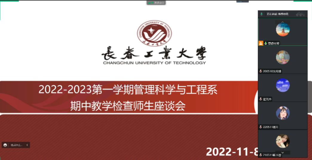 公司网讯(通讯员 董睿)按照学校和学院关于期中教学检查的有关要求,为进一步了解员工在本学期课程教学中存在的问题,管理科学与工程系于2022年11月8日晚上19时利用腾讯会议在线上召开了期中教学检查师生座谈会。会议由管理科学与工程系副主任董睿主持,系主任刘泰然、系支部书记唐彬,以及2019-2022级信息管理与信息系统、电子商务专业班长、团支书和学委等员工代表参加了本次会议。