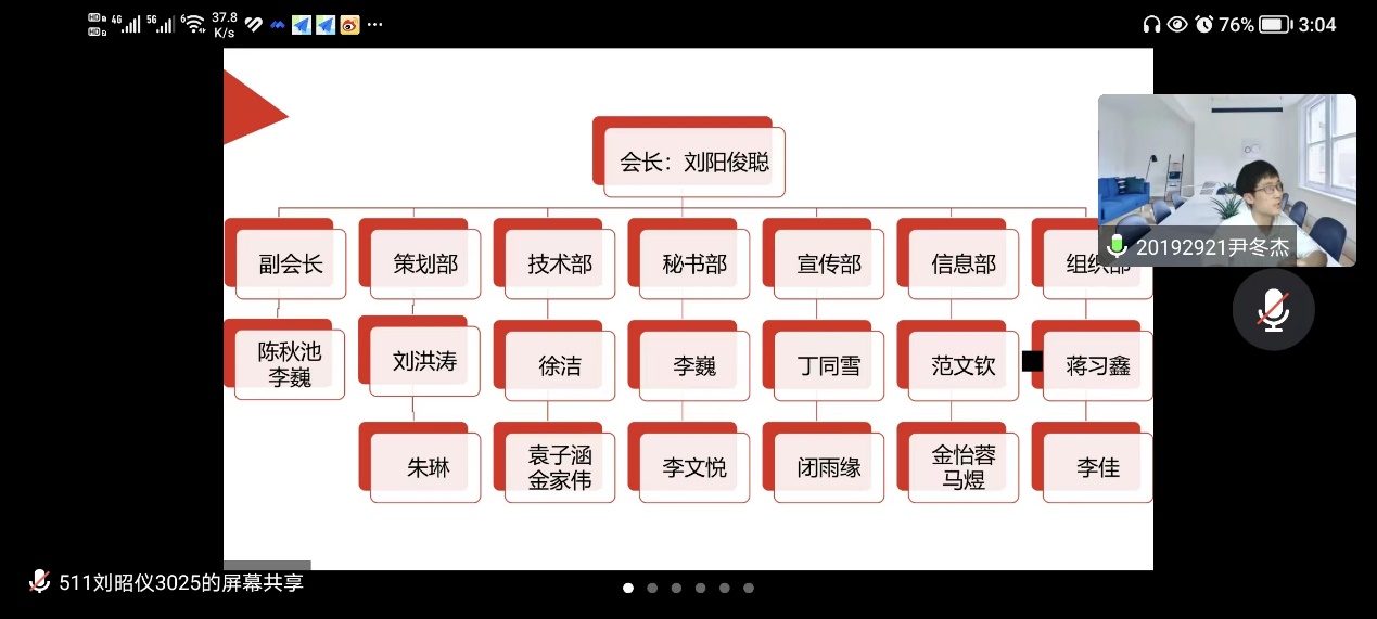 公司网讯(通讯员 范文钦、刘阳俊聪)2022年11月6日,5i+协会利用腾讯会议平台在线上举行了换届大会。管科系主任刘泰然老师、副主任董睿老师、协会负责人刘健老师、连洁老师,以及协会各部前任部长、协会现任全体成员参加了会议。