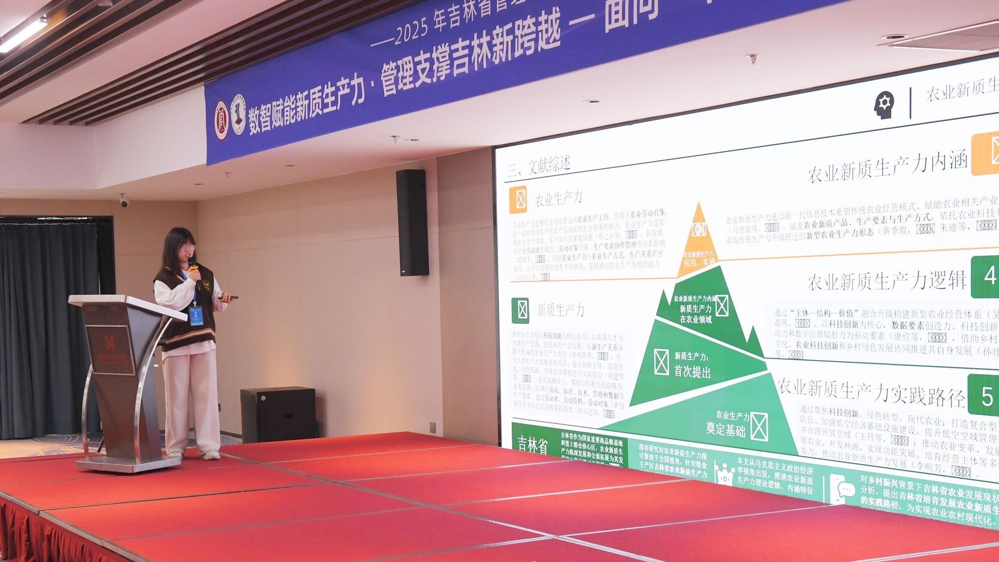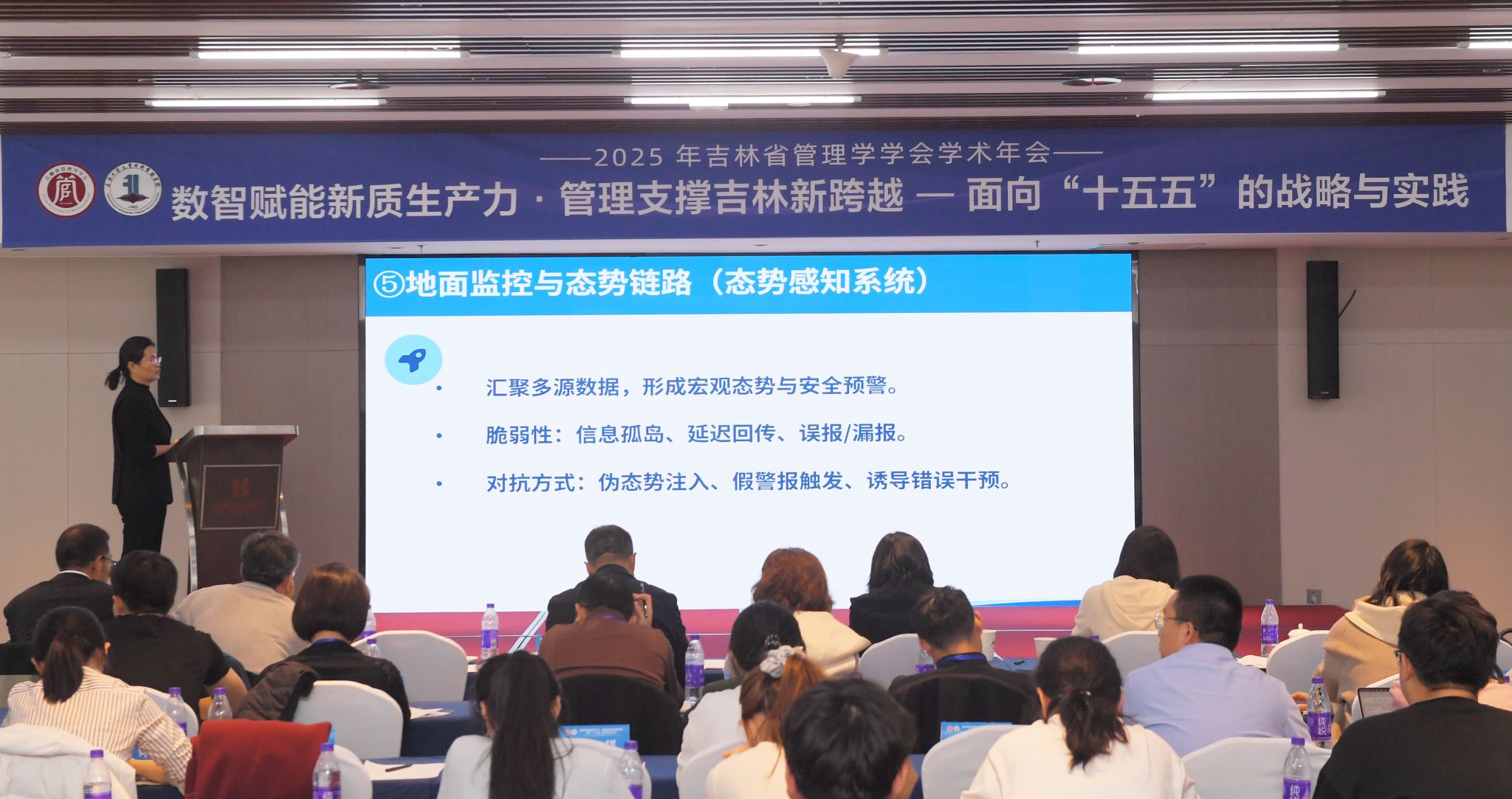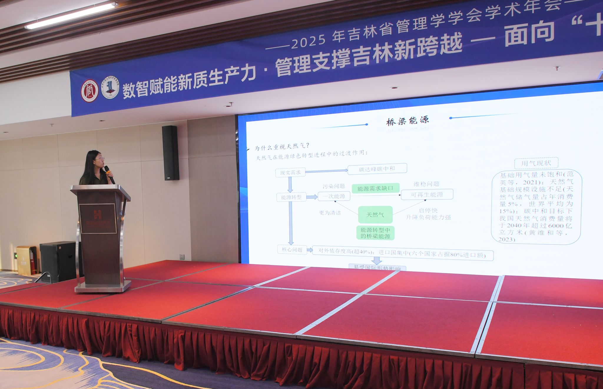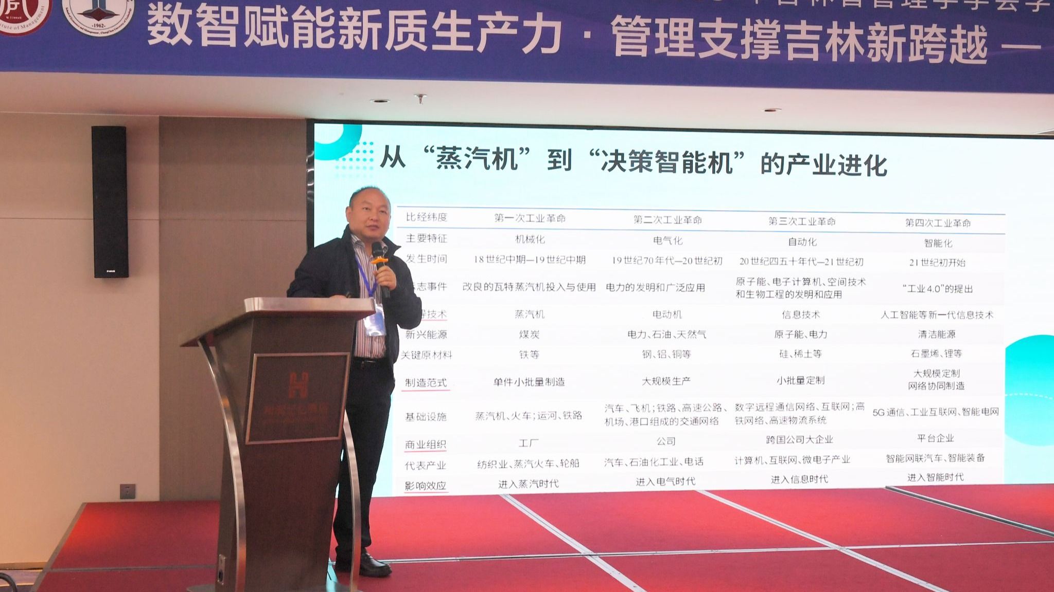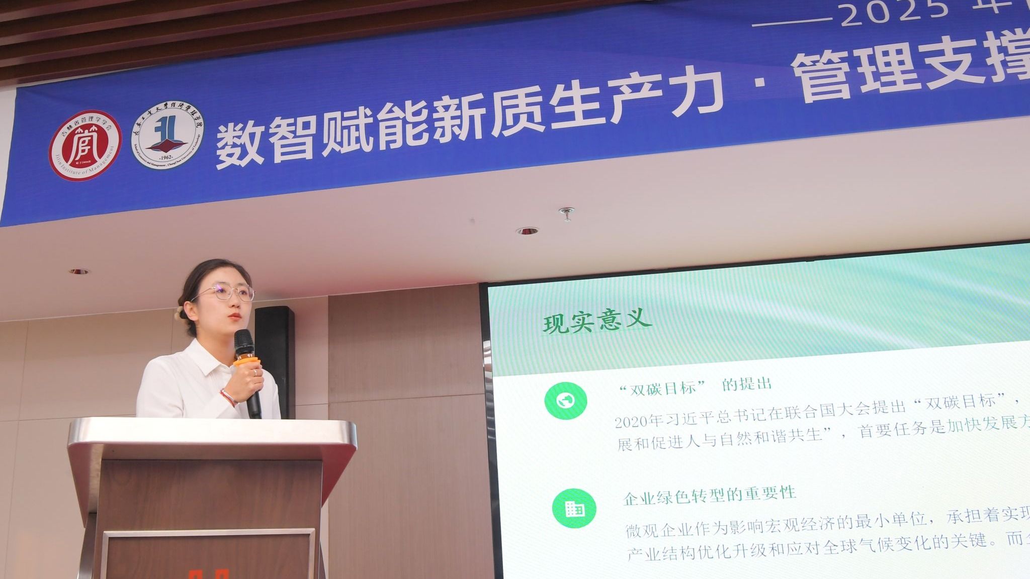 在主旨报告环节,多位杰出学者围绕年会主题展开深入探讨。同济大学严钢教授系统阐释了数据驱动方法在复杂系统管理与预测中的创新应用;上海财经大学杨金强教授从绿色债券与企业杠杆动态的角度,揭示了绿色金融影响实体经济的内在机制;吉林财经大学安明友教授立足吉林省情,提出了高端制造业发展的战略路径;吉林大学张公一教授深入剖析了低空经济产业创新生态系统的构建逻辑;白城市能源局李飞军局长探讨了"双碳"目标下新能源高质量发展的实施策略;吉林大学董保宝教授则聚焦产业大数据与人工智能融合,解析了企业决策模式的转型机制。