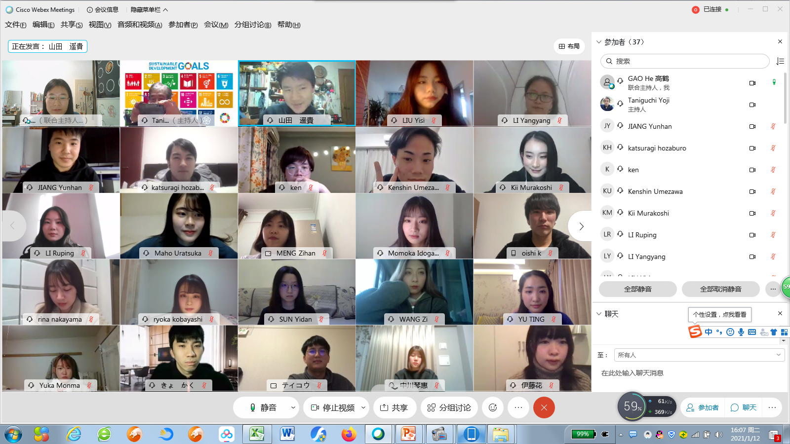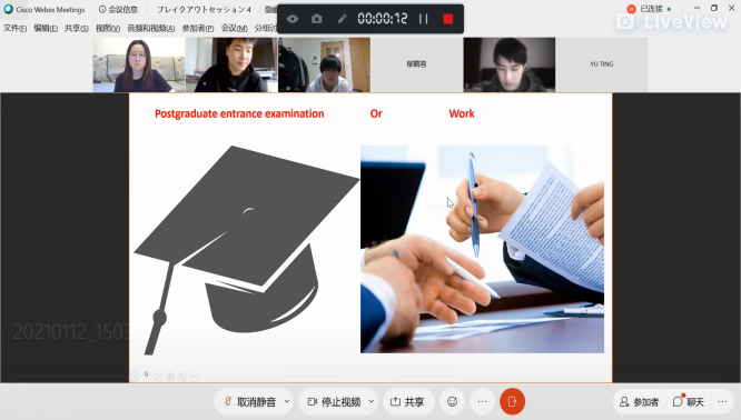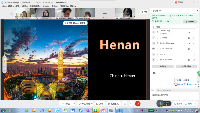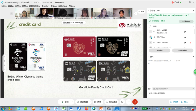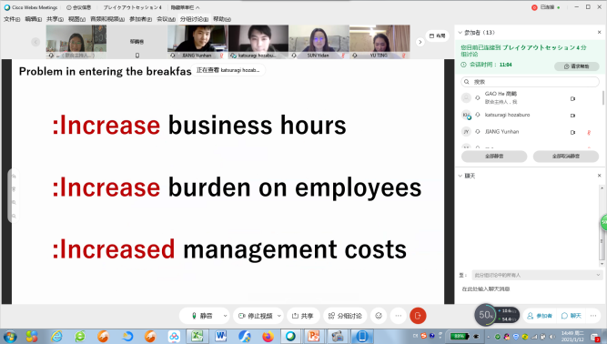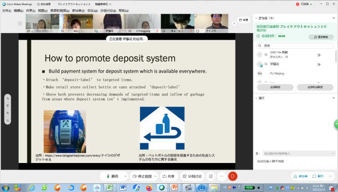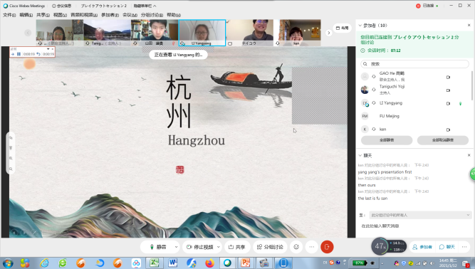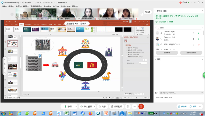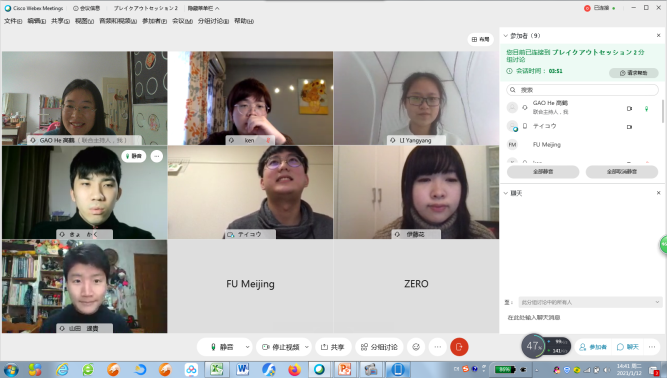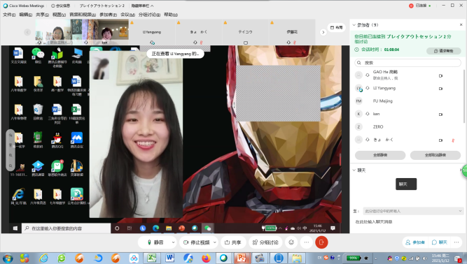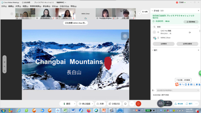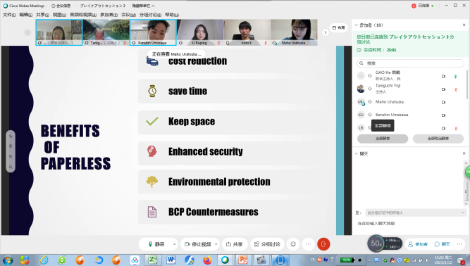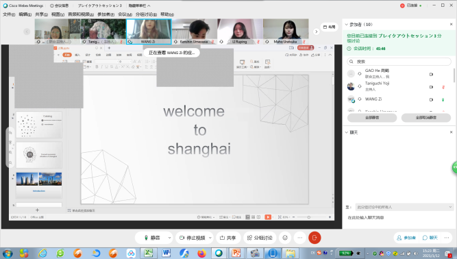 此次参加交流的人数和题目都比较多,根据之前双方的计划安排,谷口老师在Webex meeting里将其分成4个小组,每个小组由两位中方员工和一个日方分队,以及若干其他参与者组成。尤其一提的是,谷口老师非常细心,专门为没有中国职工的3个小组配备了一名二年级中国职工,使得双方沟通更为流畅,会后员工们反馈效果确实非常好。三位中日员工团队队长分别介绍了各自团队情况,随后进入到不同的Webex room里展开交流。