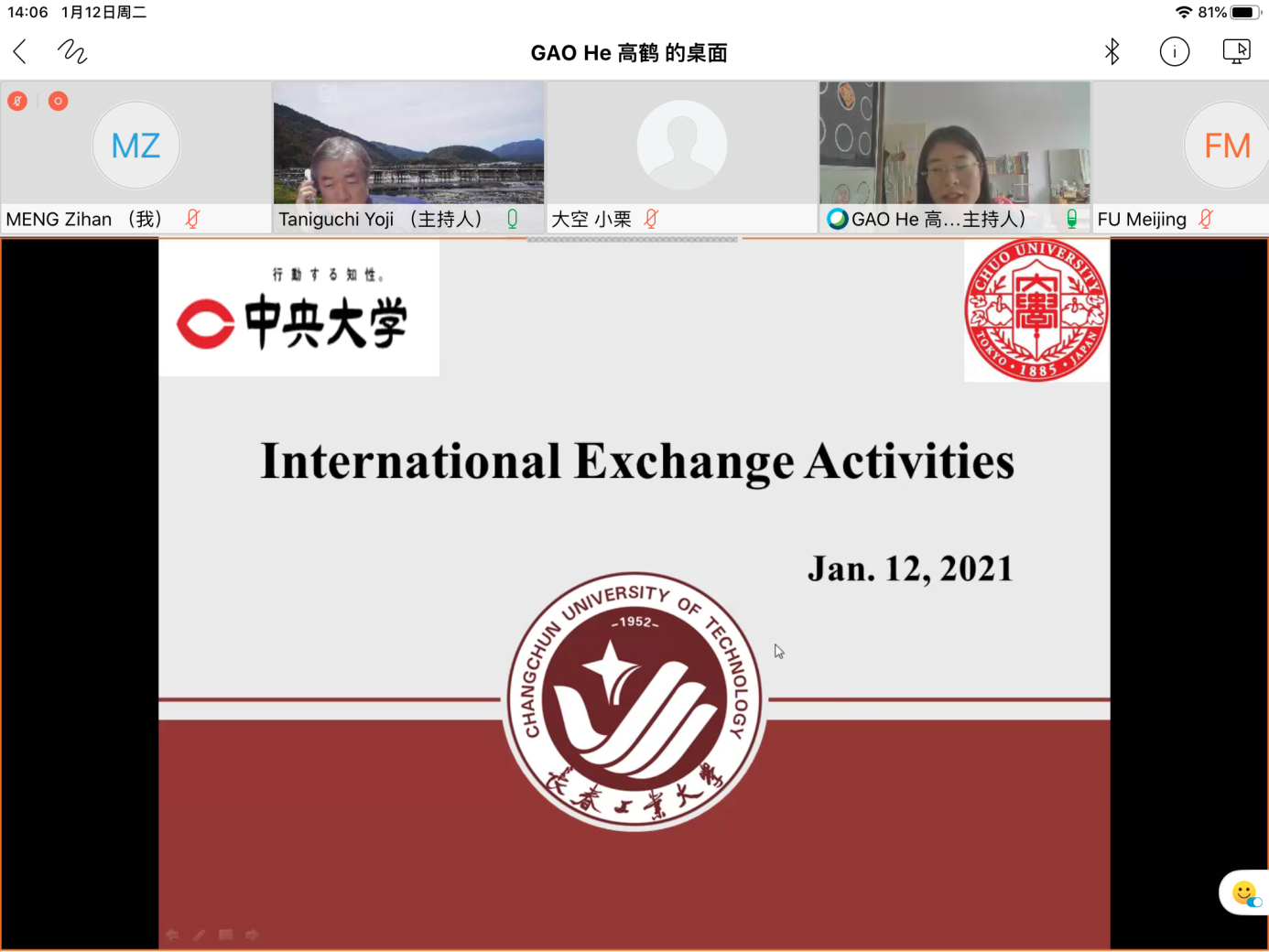 2021年1月12日14:00,第三场首届本科生国际交流系列活动按计划如期举办。本次国际交流会仍由经济系副主任高鹤副教授与日本中央大学经济学部谷口洋志教授合作组织并担任联合主持人。这是继1月5日成功举办交流会后,与经济学部开展的第二次交流活动,组织安排更加周密细致,交流氛围也更加亲切热烈。