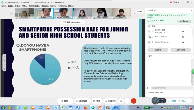 参加此次交流活动的中方员工,主要成员是由高鹤老师指导的2018级国际经济与贸易专业和金融学专业的李洋洋、符美静、孟子涵、刘奕斯、李茹萍、王梓、孙艺丹、姜雲瀚等8人组成的第二团队。李洋洋担任团队队长,并制作了精美的团队介绍小视频。日方团队则主要由谷口教授指导的三年级seminar员工组成,参加发表的有山田遥貴(YAMADA Haruki)、葛城鵬三郎(KATSURAGI Hozaburo)等15名日本员工以及郑浩、许赫、蹇权炜3名中国职工,此外还有二年级seminar十几名自发前来辅助交流、聆听和参与讨论的中国职工和日本员工,共计40余人参加了此次交流活动,规模空前。