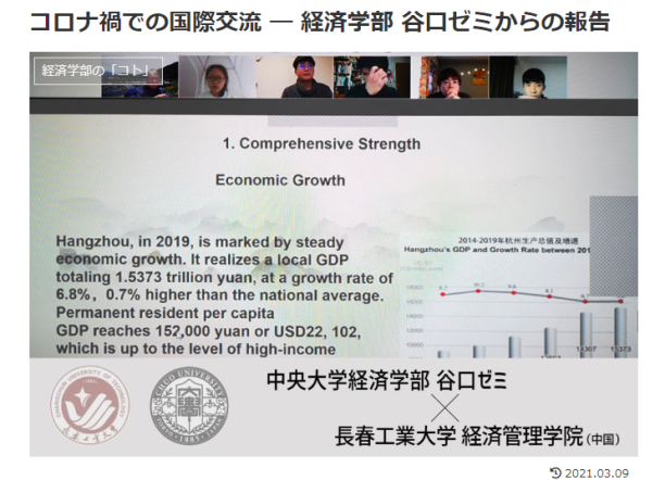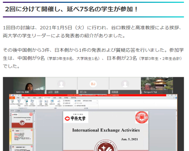 由于新冠疫情的蔓延,原计划的实地国际研学活动受到阻隔。高鹤老师与中央大学经济学部的谷口洋志教授、国际经营学部的杨川博士经过多次协调沟通,就举办线上本科生国际交流活动达成了共识,拟定了活动方案。在双方老师的共同努力下,中日员工们的参与热情特别高涨,不仅认真准备了交流话题和内容,还精心设计了活动流程。四场交流活动,日方老师带领各自指导的学术研讨班(seminar)员工共计108人参加,我方高鹤老师带领25名本科生和1名学术型研究生参加,分组进行了热烈讨论。