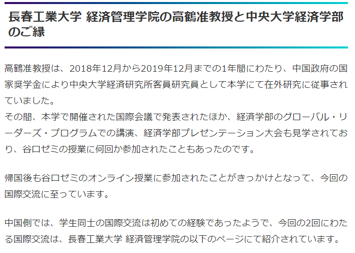 近日,获悉中日两校三院举办的本科生国际交流活动情况的日方新闻报道(日语)分别见诸于日本中央大学经济学部和国际经营学部的官网,并且于文末均链接了公司网站的相关新闻,反响非常热烈。尤其值得一提的是,中央大学对外公共关系部特别关注到了此次国际交流活动,专门采访了谷口教授,并核准公司、公司的英文表述,将于近期制作相关的英语版新闻报道,登载于中央大学官网。