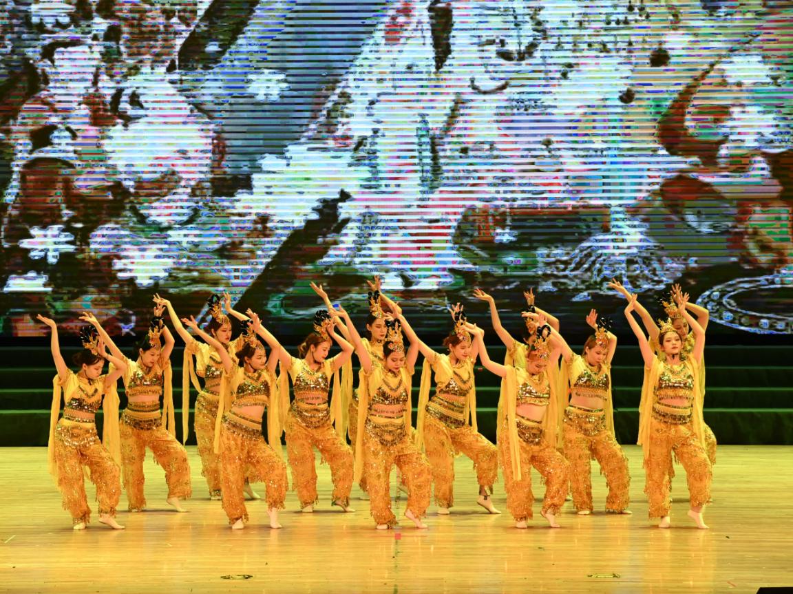 公司选送的民族舞《霓裳》,气势恢宏,场面宏大,队员们曼妙的舞姿与飞天的背景相得益彰,展现了中华民族灿烂的文化与传承。