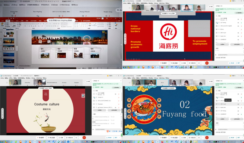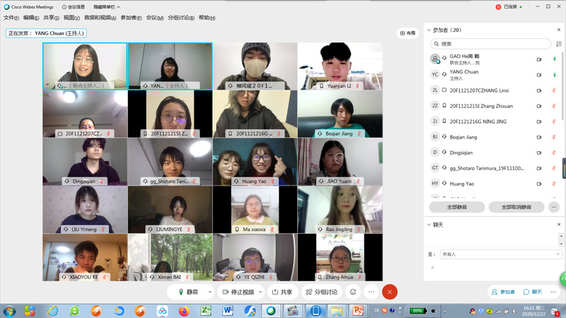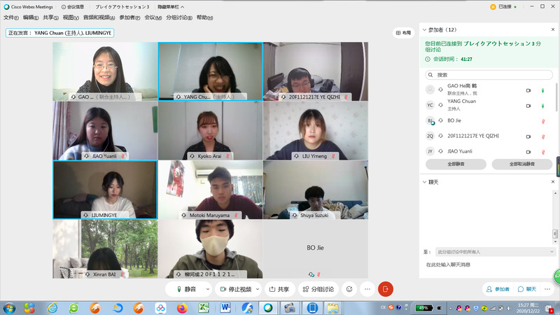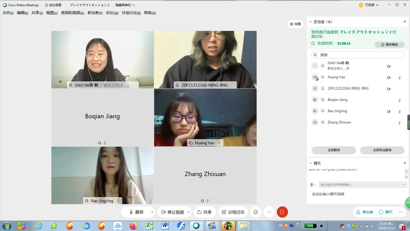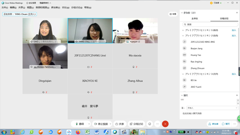 总体介绍后,利用Webex平台内的分组功能,将双方团队各分为三个小组,分别展示各自准备的精彩内容,并展开激烈讨论。期间高老师和杨老师随机加入到各小组聆听发表和参与讨论。