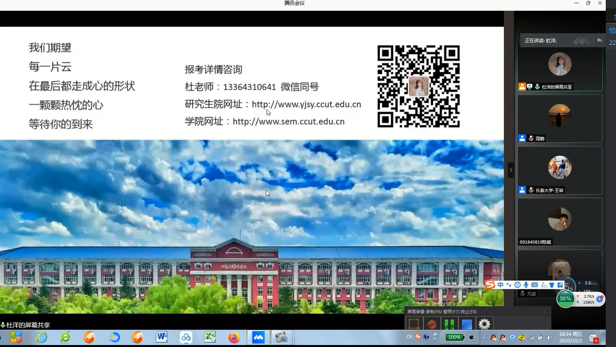 2021年硕士研究生招生工作启动以来,经济系广开言路、积极开展各种形式的招生宣传活动。系副主任高鹤与长春大学经济学院的相关领导和老师通过多次沟通,确定面向其2017级、2018级的国际经济与贸易专业和经济学专业的在校员工进行线上宣讲。10月2日,宣讲会如期举办,由公司MBA教育中心办公室主任杜洋作为主讲人,经济系主任张璇一同参加。