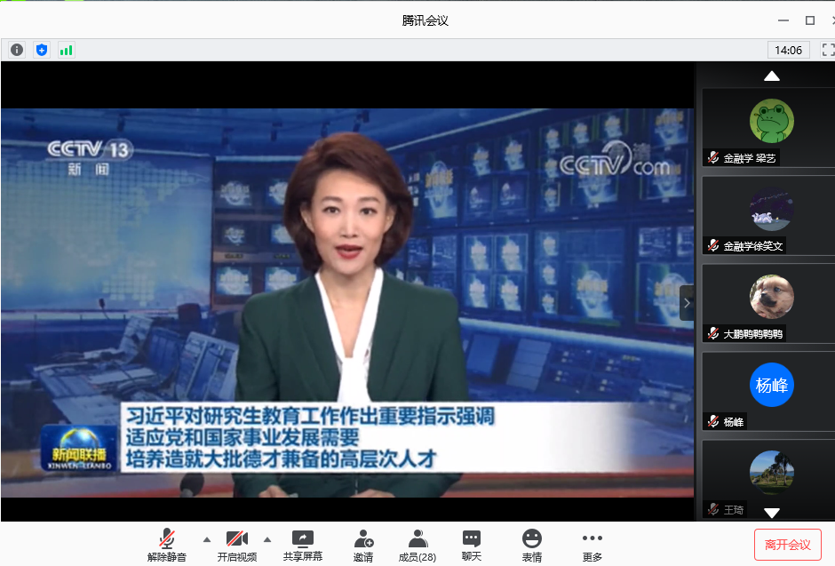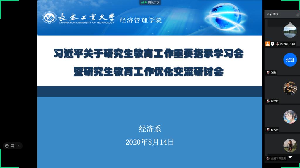 8月14日下午,经济系“习近平关于研究生教育工作的重要指示”学习会暨研究生教育工作优化交流研讨会在线上成功召开。经济系主任张璇、副主任高鹤出席会议并讲话,经济系全体研究生导师以及在读研究生参加会议。会议由经济系支部书记孙小明主持。