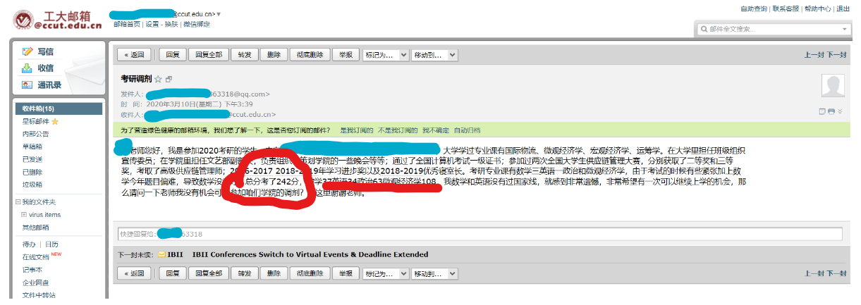 2月24日,学校研招办发出了《ylzzcom永利总站线路检测2020年硕士研究生招生预调剂公告》。一时间,经管学院的研招联系人电话被打爆,微信被刷爆,QQ被加爆。一边是耐心细致解答各类咨询,一边是即时回复各类提问。