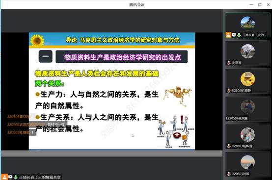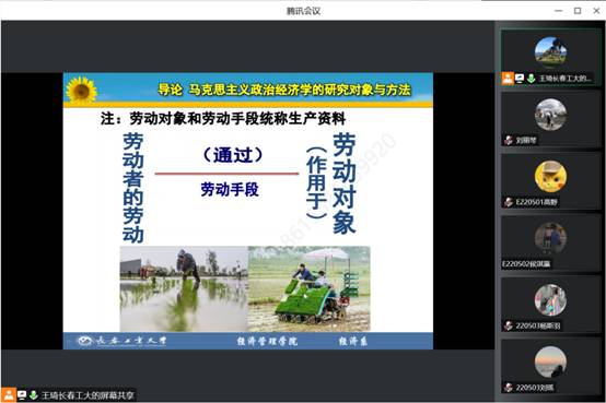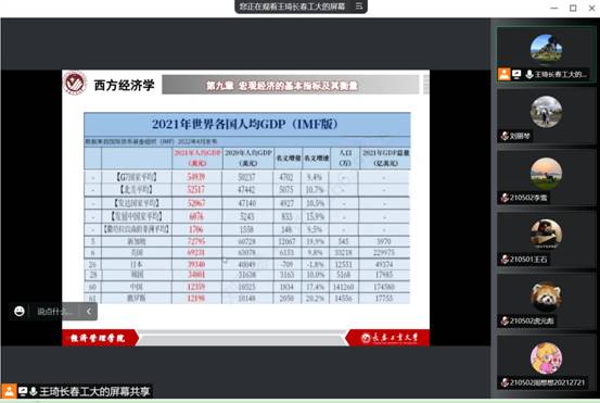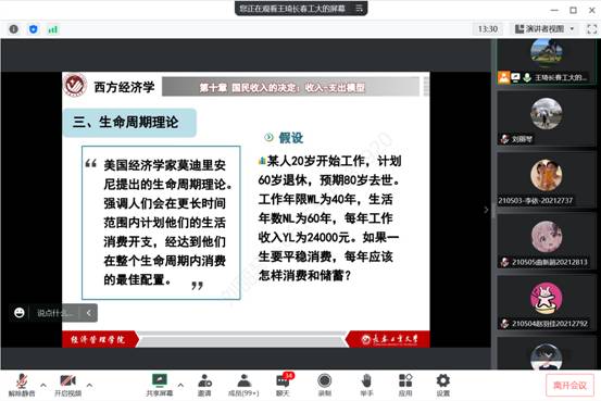 王琦老师本学期承担了《宏观经济学》、《政治经济学》等课程,教学工作量虽然较大,但她对待每一节课都一丝不苟。几十年如一日坚持至少提前15分钟进入课堂。在线下授课时,王老师会利用上课前的时间做好各种上课准备,同时和员工充分交流教学反馈,以便及时调整授课内容和授课方式。在线上授课中,王老师充分利用腾讯会议的签到在完成课前签到的同时,充分与员工进行互动交流,为正式上课铺垫了融洽而充满求知的氛围。