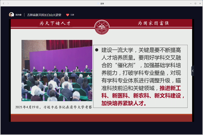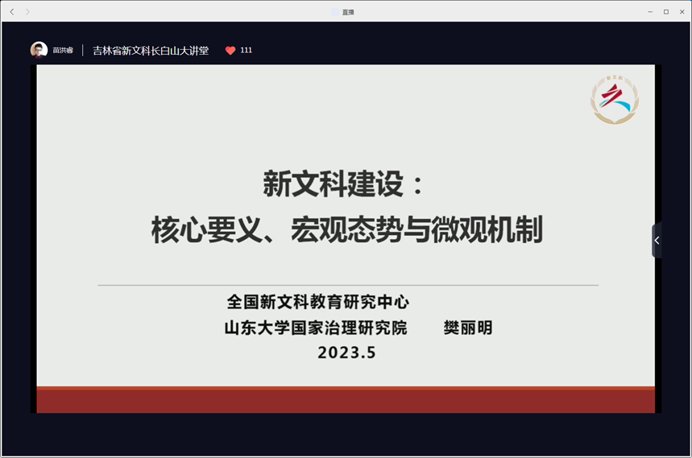 公司网讯(通讯员 刘泰然)2023年5月9日,由吉林省教育厅主办,吉林师范大学承办的吉林省新文科“长白山大讲堂”隆重举行, 本次大讲堂采取线上线下相结合的形式进行,管理科学与工程系组织教师参加了此次活动。