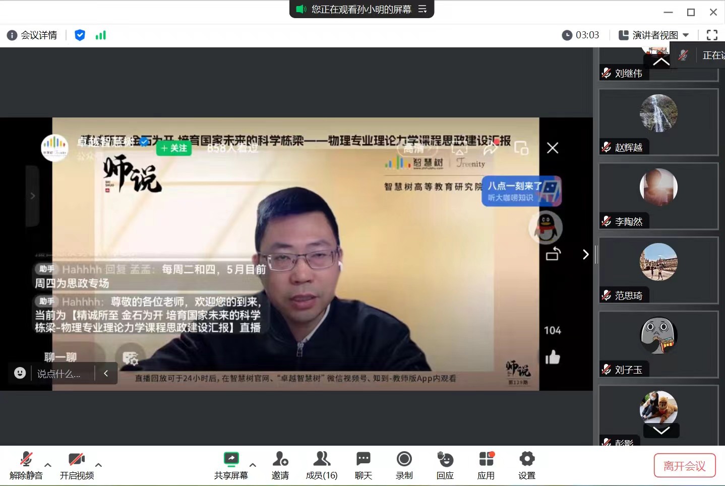 培训直播中,哈尔滨工业大学任延宇教授分享了题为《精诚所至金石为开 培育国家未来的科学栋梁》的报告,阐述了物理专业理论力学课程思政建设的基本情况。